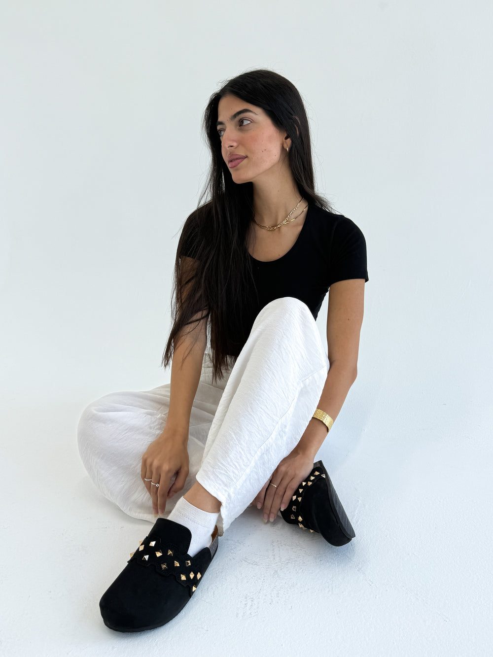Step into effortless style with these black suede slip-on mules, designed with a chic scalloped edge and embellished with edgy gold stud accents. Featuring a cushioned insole for comfort and a versatile silhouette, these mules are perfect for pairing with casual denim or elevating a polished day-to-night look. A modern twist on a classic design, they’re both stylish and easy to wear.