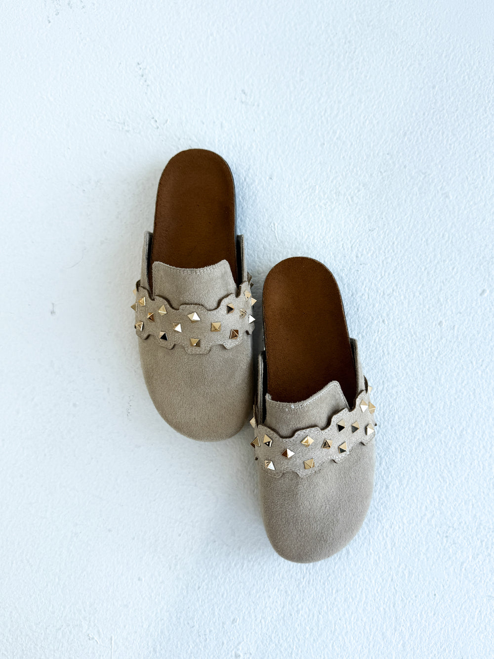 Beige Suede Slip-On Mules with Gold Studs
