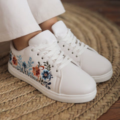 Step into style with these flowery kicks! Stand out from the crowd with these floral embroidered sneakers in crisp white. Perfect for a playful and trendy look.