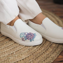 Step into a garden of comfort with our Rose Embroidered Slip-Ons in white. These shoes feature beautiful rose embroidery that will add a touch of elegance to any outfit. Slip them on to feel like you're walking on clouds (don't worry, it's not just a fEAture!).