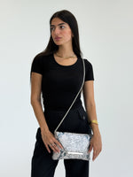Channel sleek sophistication with this silver snake print envelope clutch, featuring a textured faux snakeskin design and a polished silver-tone bar accent. Its versatile chain strap allows for both shoulder and crossbody wear, while the structured silhouette keeps your look effortlessly chic. Perfect for evenings out, formal occasions, or adding an edgy yet elegant touch to your outfit.