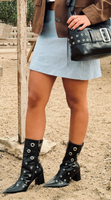 These black eyelet heel boots are the ultimate power piece for the woman who owns her style. The secure side zip closure makes them effortless to wear, and the comfortable block heel ensures you can confidently navigate your day or dance through the night. They are an authentic expression of sophisticated, fearless fashion.