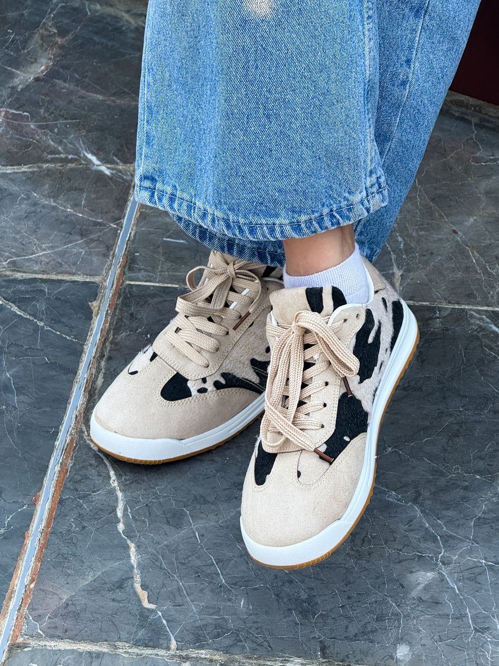 Unleash your wild side with the Beige Suede & Animal Print, a stylish blend of sophistication and edgy fashion. Designed for those who love statement footwear, these sneakers feature: