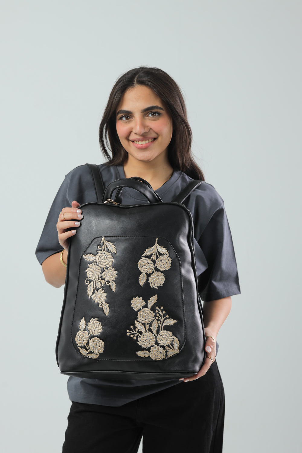 Laptop Backpack Embroidered Flower - Black