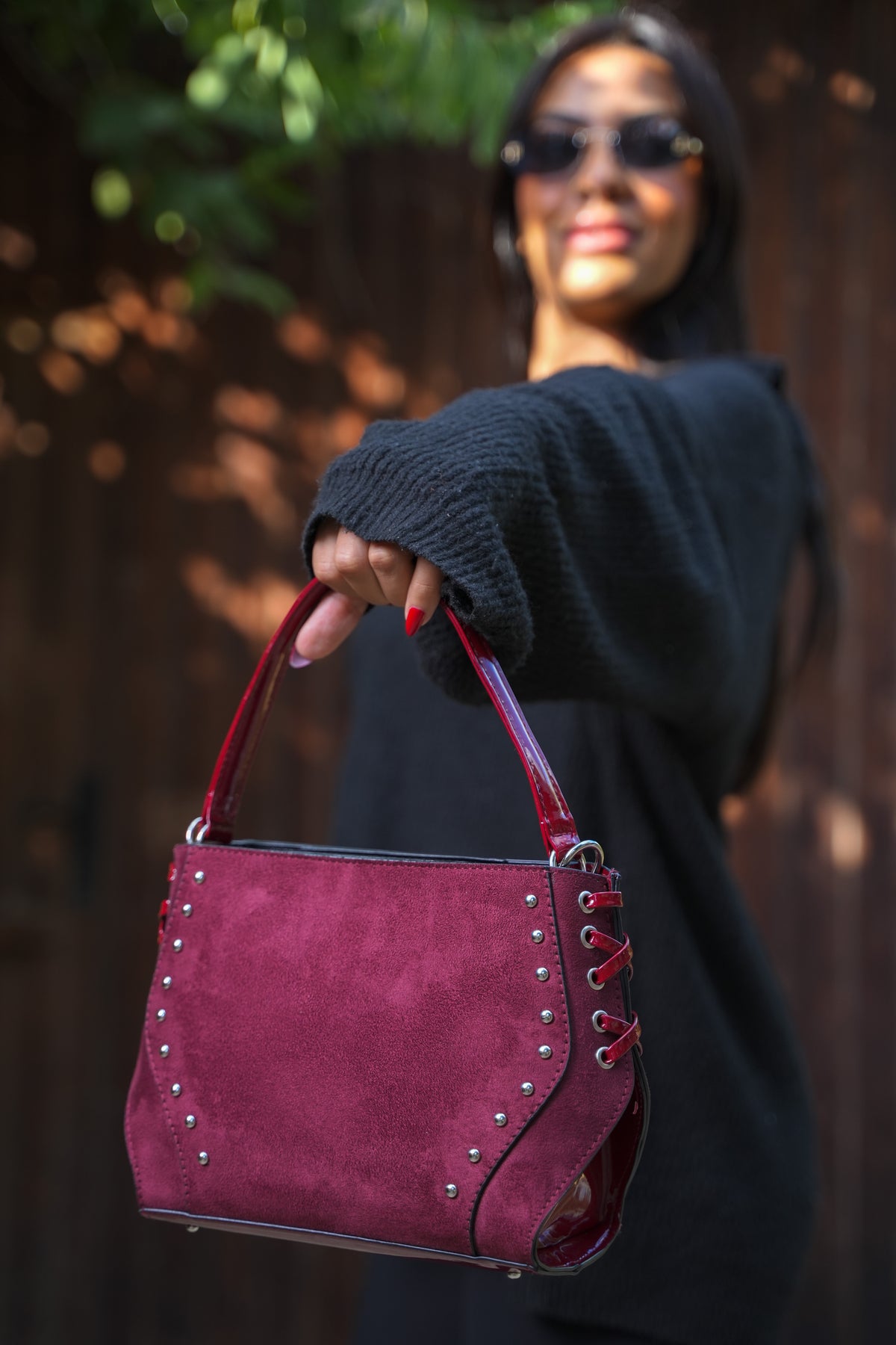 Make a sophisticated statement with this Lace-Up Handle Suede Handbag, a perfect blend of elegance and modern design. Crafted from rich faux suede, this structured bag features sleek patent handles and lace-up side details accented with metallic eyelets for a stylish twist.
