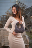 Step into modern elegance with the Ivory Nova Studded Shoulder Bag, a chic vegan leather crescent bag with silver studs — perfect for everyday glam and evening sophistication.