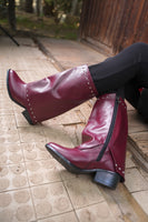 Burgundy patent mid-calf boots Women's studded riding boots Flat heel biker boots Glossy burgundy fashion boots Silver stud detailed footwear Pull-on knee high boots Confident designer footwear Modern burgundy leather boots