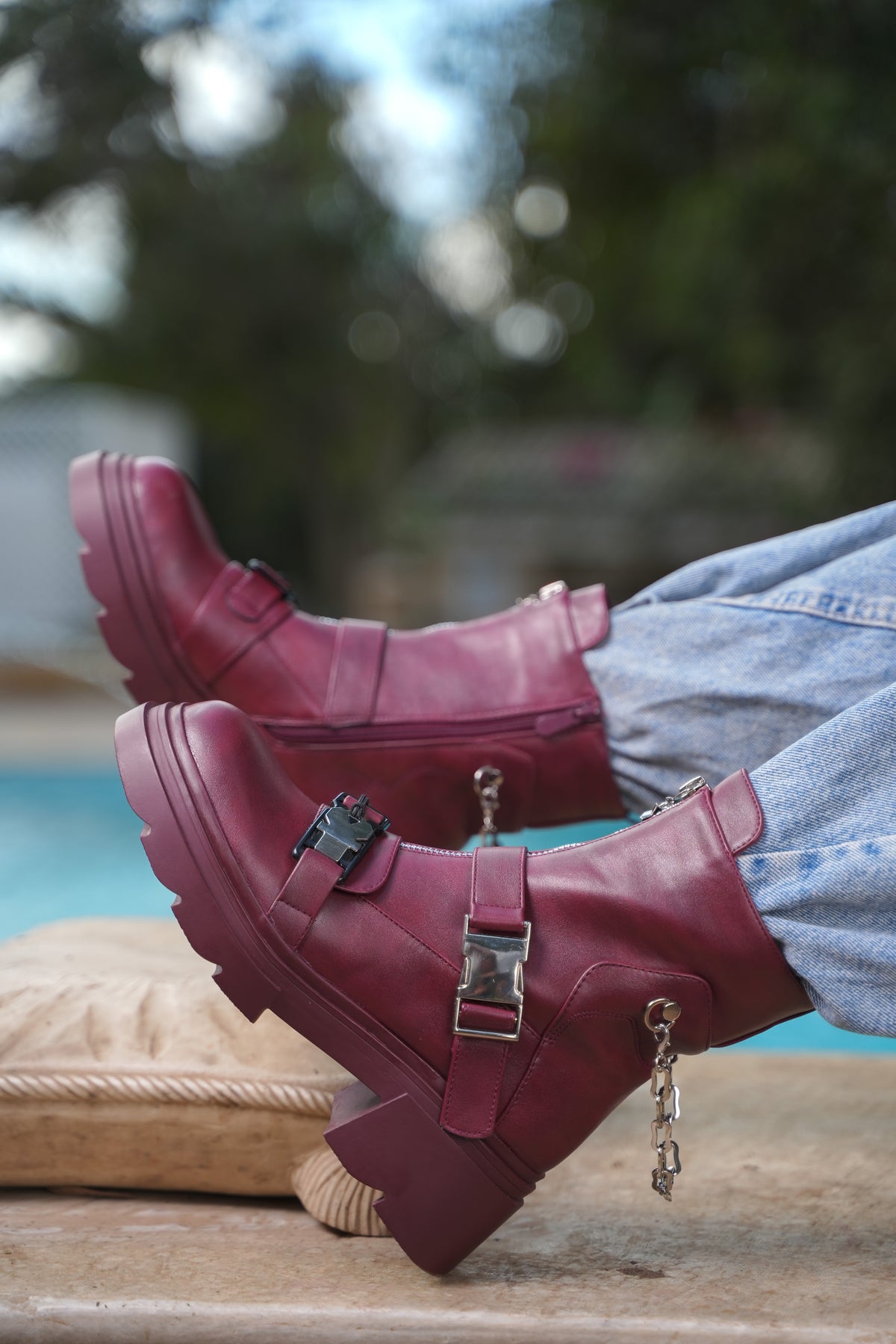 women’s fashion boots Egypt, chain ankle boots, chunky boots for women Cairo, Havva Dose winter collection, stylish combat boots Egypt, burgundy ankle boots.
