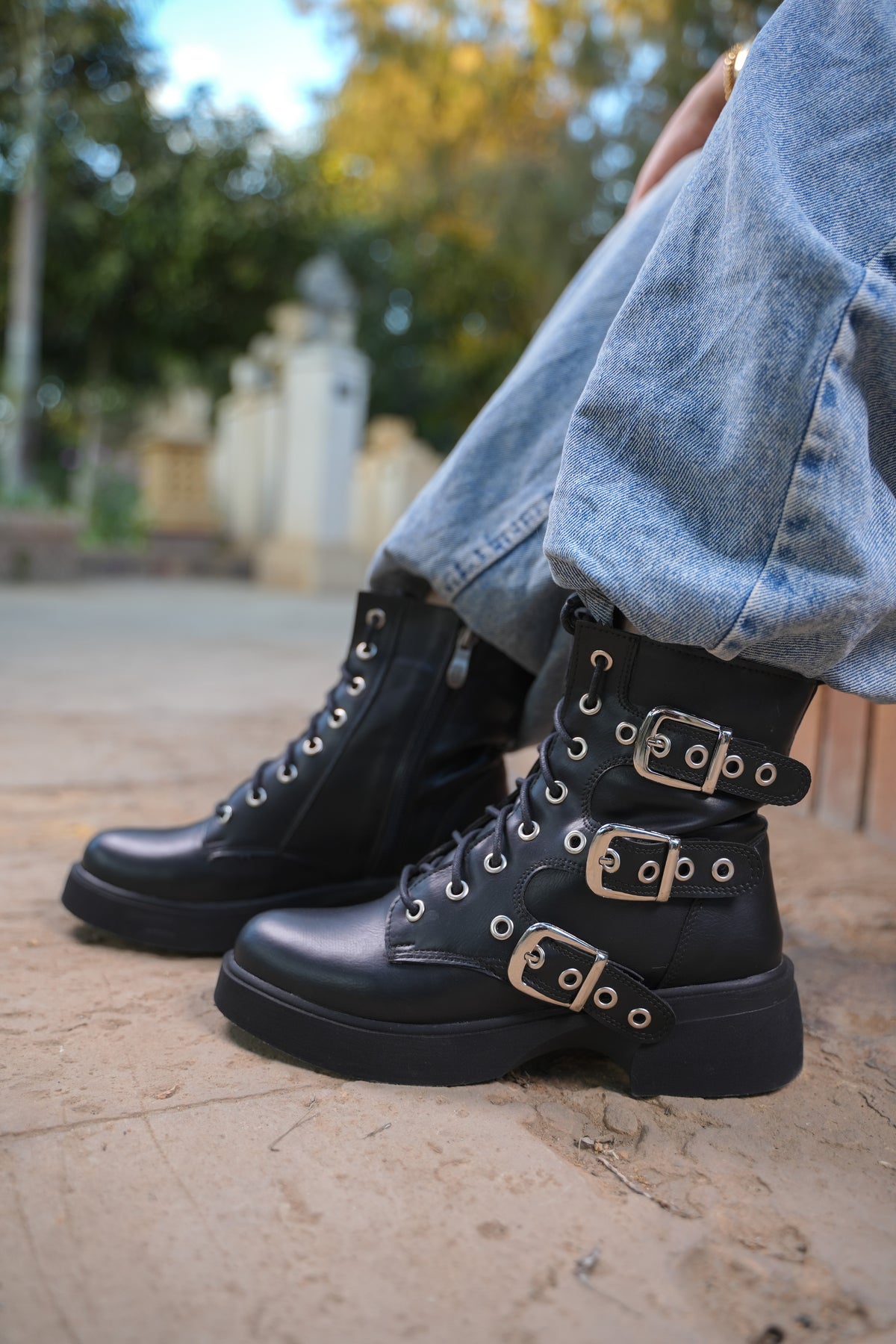 Command attention with these Midnight Rebel Buckled Combat Boots, where bold design meets lasting comfort. Crafted from smooth premium black leather, these boots feature triple silver buckle straps and lace-up detailing that add a rugged, statement-making edge.