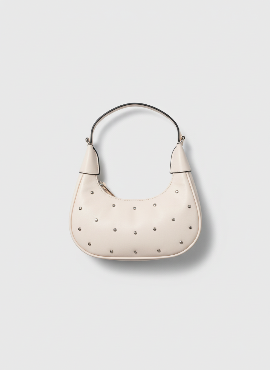 ivory shoulder bag, white crescent handbag, studded vegan leather purse, women’s elegant handbag, minimalist designer bag, cream crossbody bag, trendy 2025 handbags, modern white leather bag, luxury vegan fashion, chic studded purse