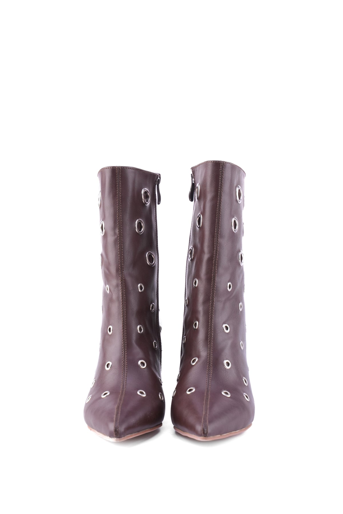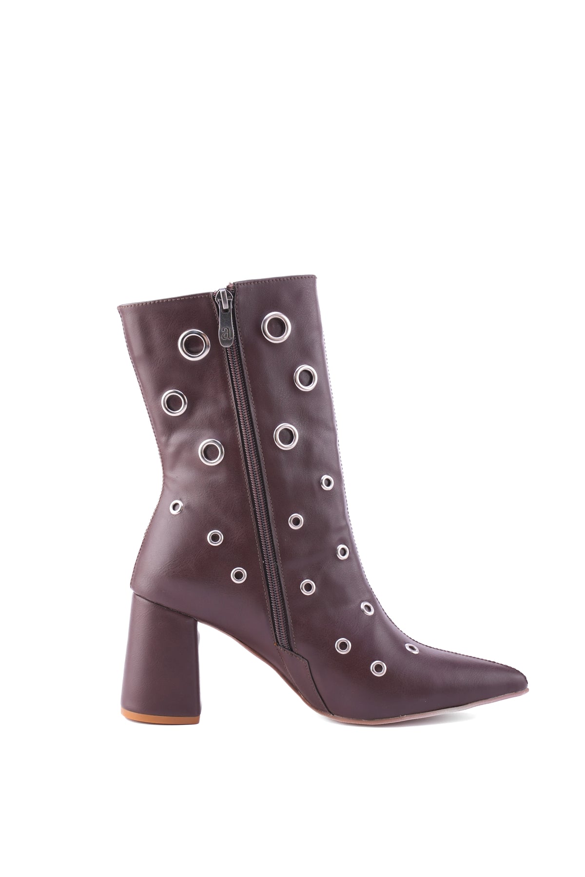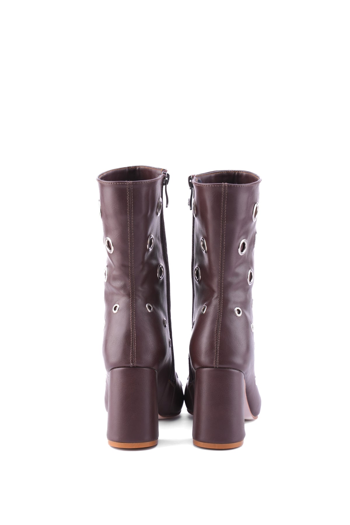 These chocolate brown eyelet heel boots are designed for the woman who commands attention with effortless grace. The secure side zip allows for easy wear, while the comfortable block heel ensures you can confidently navigate your day or dance through the night. They are an authentic expression of sophisticated, contemporary style.