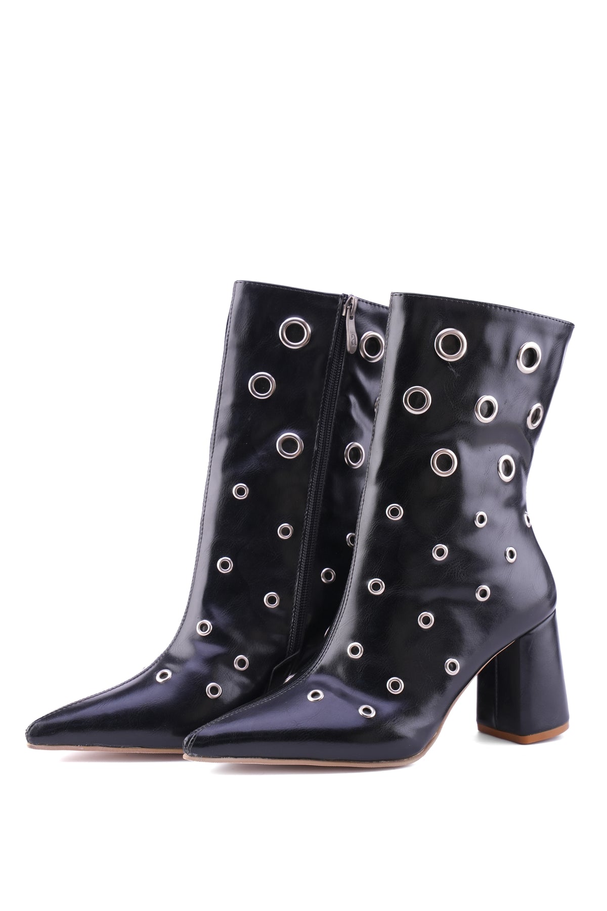 These black eyelet heel boots are the ultimate power piece for the woman who owns her style. The secure side zip closure makes them effortless to wear, and the comfortable block heel ensures you can confidently navigate your day or dance through the night. They are an authentic expression of sophisticated, fearless fashion.