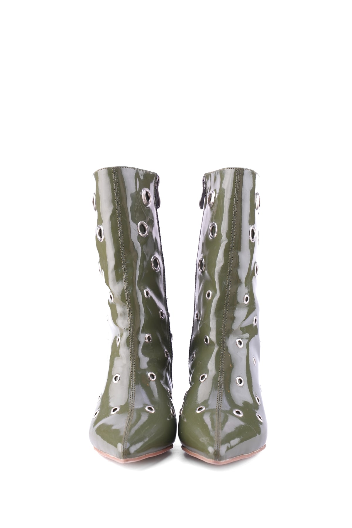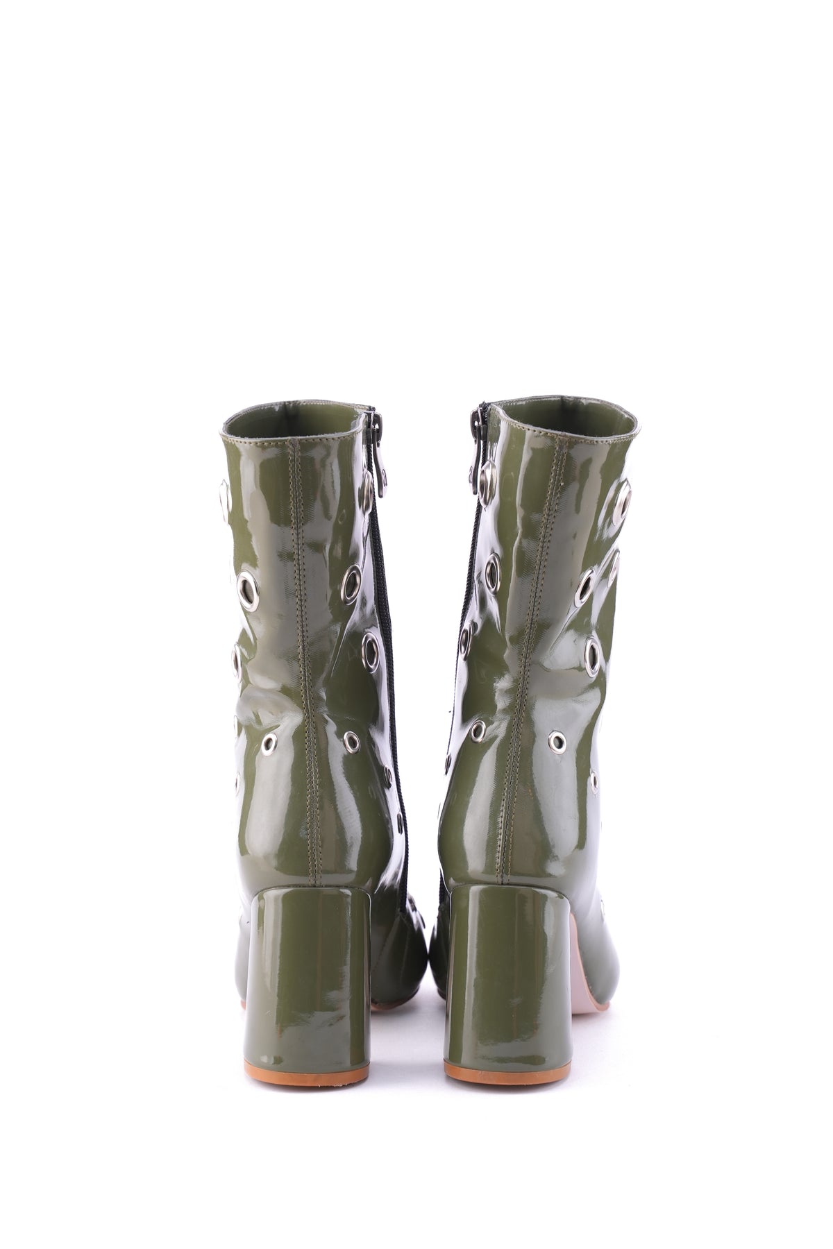 These olive green patent ankle boots are the ultimate power piece for the woman who owns her look. The secure side zip ensures they slip on easily, while the comfortable block heel lets you wear this bold style all day or all night. They are an authentic expression of modern, fearless fashion.