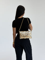 Elevate your evening look with this champagne gold envelope clutch, lavishly embellished with shimmering sequins and intricate geometric patterns. The metallic tones paired with a delicate gold chain strap make it both dazzling and versatile. Whether carried as a clutch or worn over the shoulder, this piece is perfect for weddings, formal dinners, or any occasion where timeless elegance and sparkle are a must.