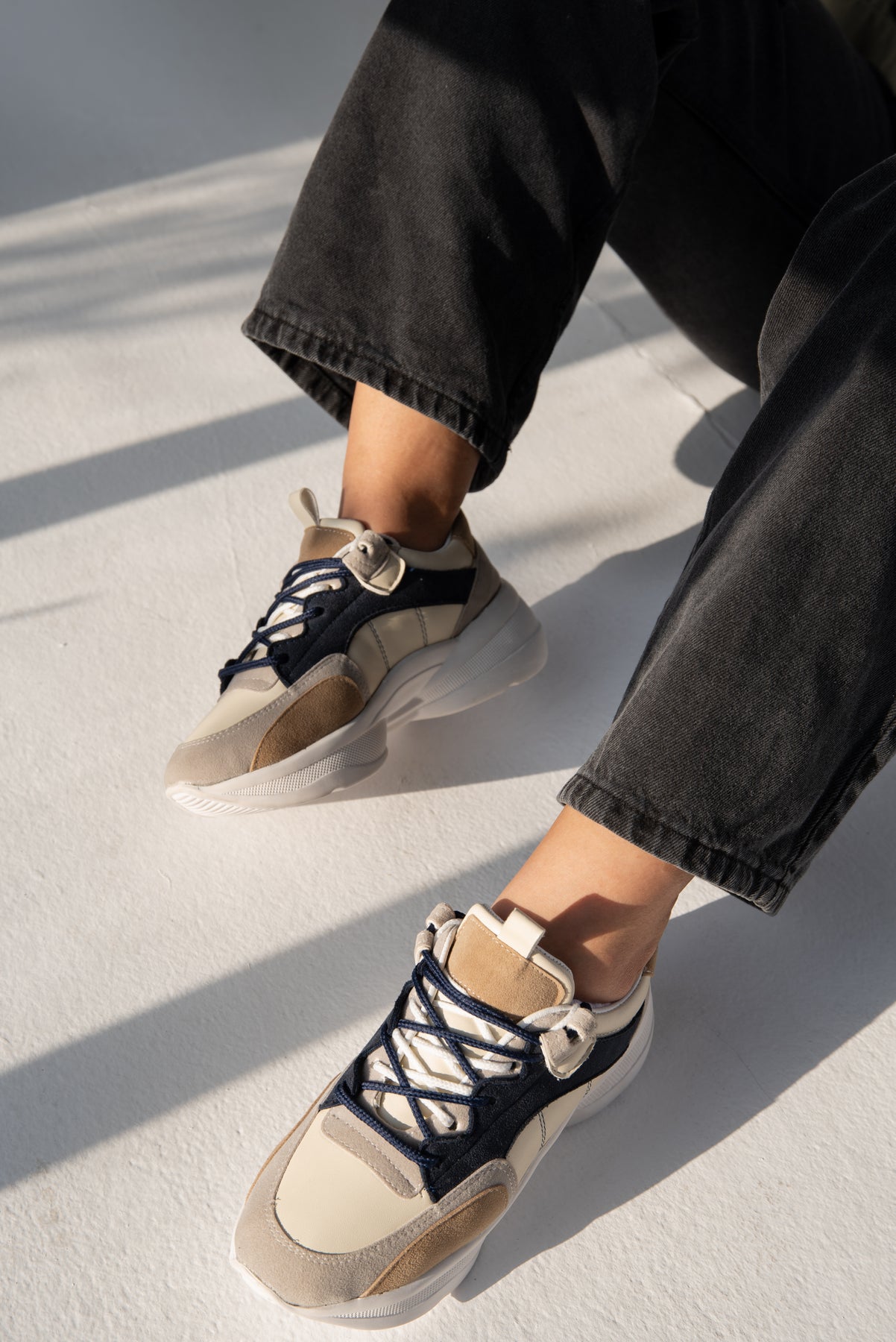Introducing the Chunky Sneaker Lined - Beige X Navy Blue: a perfect blend of style and comfort! Elevate your shoe game with these eye-catching sneakers that are sure to turn heads. With their chunky silhouette and trendy colour combination of beige and navy blue, these sneakers are a must-have for any fashion-forward individual.