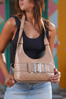 Turn heads with the Verona Belt Shoulder Bag — a structured chestnut vegan leather handbag with a bold belt detail and metallic accents, perfect for everyday edge and elegance.