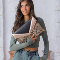 Get ready to turn heads with the Python Envy Clutch Bag in Rose! This stylish bag is perfect for any occasion with its unique design and versatile functionality. Keep all your essentials organized in one place and make a statement with this playful and quirky accessory. (P.S. Your friends will be green with envy.)