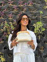 Timeless elegance meets modern flair in the Luna Frame Clutch. Crafted with a structured pearlescent body and a textured faux snakeskin finish, this clutch is topped with a natural wooden frame and rounded clasp knobs that add a vintage-inspired charm. Compact yet spacious enough for your essentials, it’s the perfect accessory for sophisticated brunches, evening events, or gallery strolls. A bold conversation piece for the effortlessly chic.