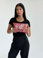 Turn up the glamour with this bold envelope clutch, beautifully adorned with red and pink sequins in a striking geometric pattern. Finished with luxe gold piping and a sleek metal bar accent, this clutch is designed to shimmer with every movement. Spacious enough for your essentials yet dazzling enough to steal the spotlight, it’s the perfect accessory for weddings, parties, or any event where you want to shine bright.