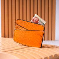 This card holder is the perfect accessory for your outfit. Put it on and you'll be shining brighter than the sun! With its bright orange hue, your cards will be held in style. It's a cool accessory with a glaze that'll never fade!