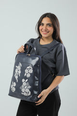 Laptop Backpack Embroidered Flower - Navy Blue