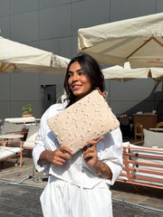 The Nomad Dots Clutch blends artisanal charm with modern minimalism. Handwoven in a soft beige fabric, this clutch features a playful dotted tuft texture that adds character without overpowering your look. Finished with a contrasting brown leather wrist strap and silver-tone hardware, it’s the perfect everyday companion for those who love effortless, earthy elegance. Ideal for coffee runs, casual outings, or a relaxed evening vibe.