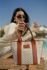 Crafted for the modern muse, the Sahara Woven Mini Tote captures the essence of earthy elegance. Featuring a textured woven body with rich tan vegan leather trim, this bag brings artisanal flair to your everyday style. Lightweight yet structured, it's the perfect companion for poolside lounging, brunch dates, or summer getaways.