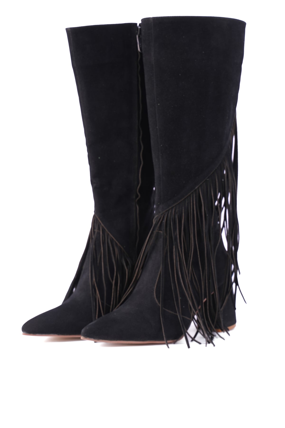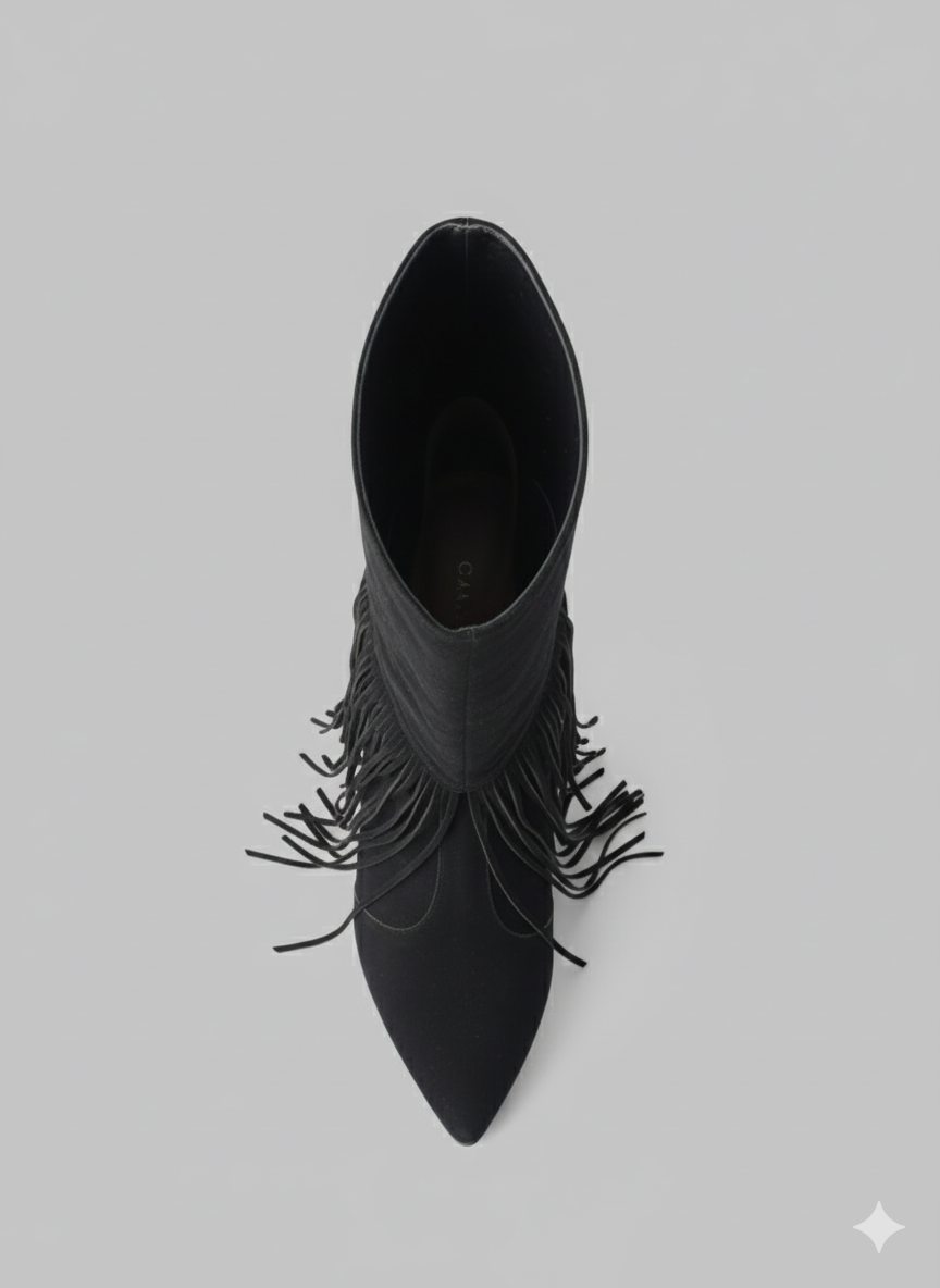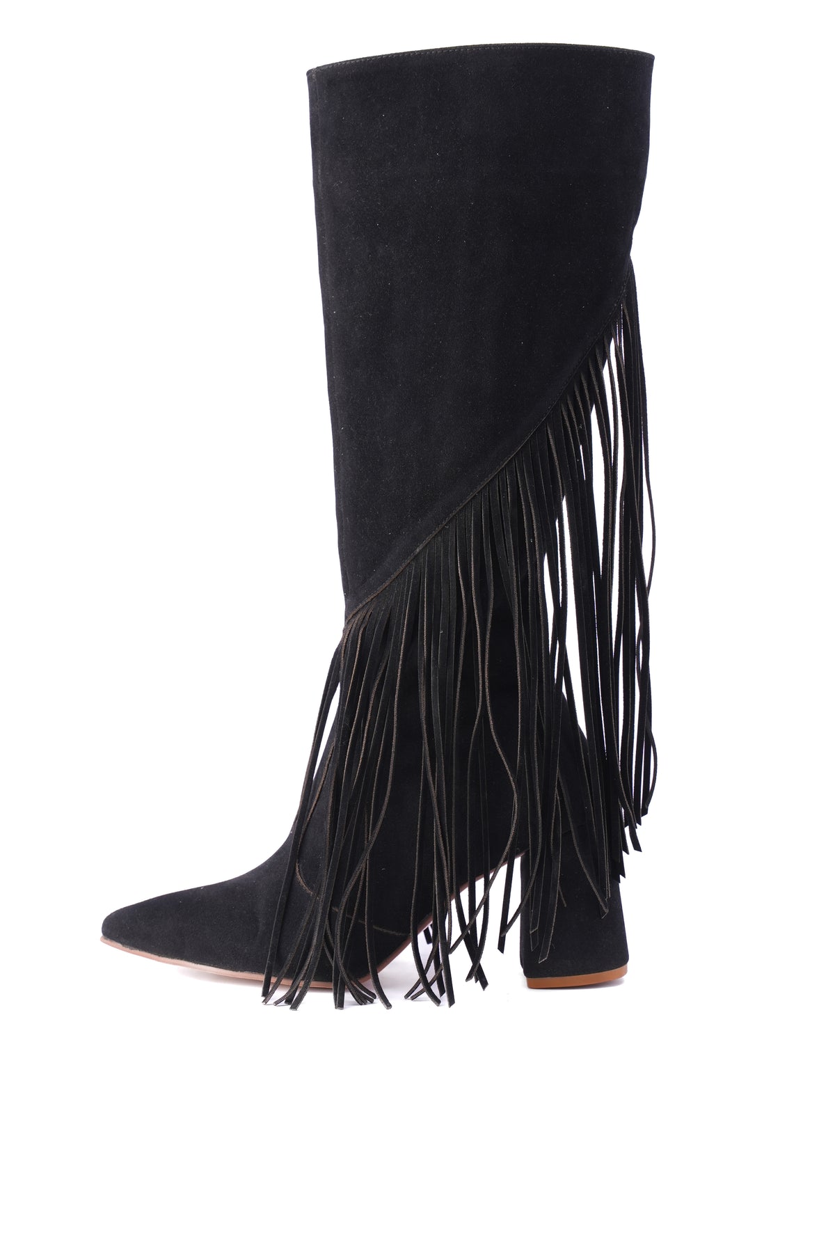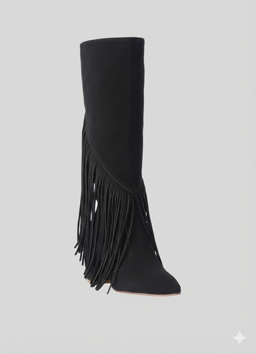 Dramatic Fringe Detailing: Cascading, full-length suede fringe sweeps dynamically from the shaft, creating mesmerizing movement with every confident stride you take.