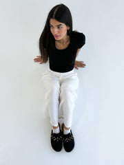 Step into effortless style with these black suede slip-on mules, designed with a chic scalloped edge and embellished with edgy gold stud accents. Featuring a cushioned insole for comfort and a versatile silhouette, these mules are perfect for pairing with casual denim or elevating a polished day-to-night look. A modern twist on a classic design, they’re both stylish and easy to wear.