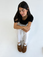 Step into effortless style with these Havane suede slip-on mules, designed with a chic scalloped edge and embellished with edgy gold stud accents. Featuring a cushioned insole for comfort and a versatile silhouette, these mules are perfect for pairing with casual denim or elevating a polished day-to-night look. A modern twist on a classic design, they’re both stylish and easy to wear.