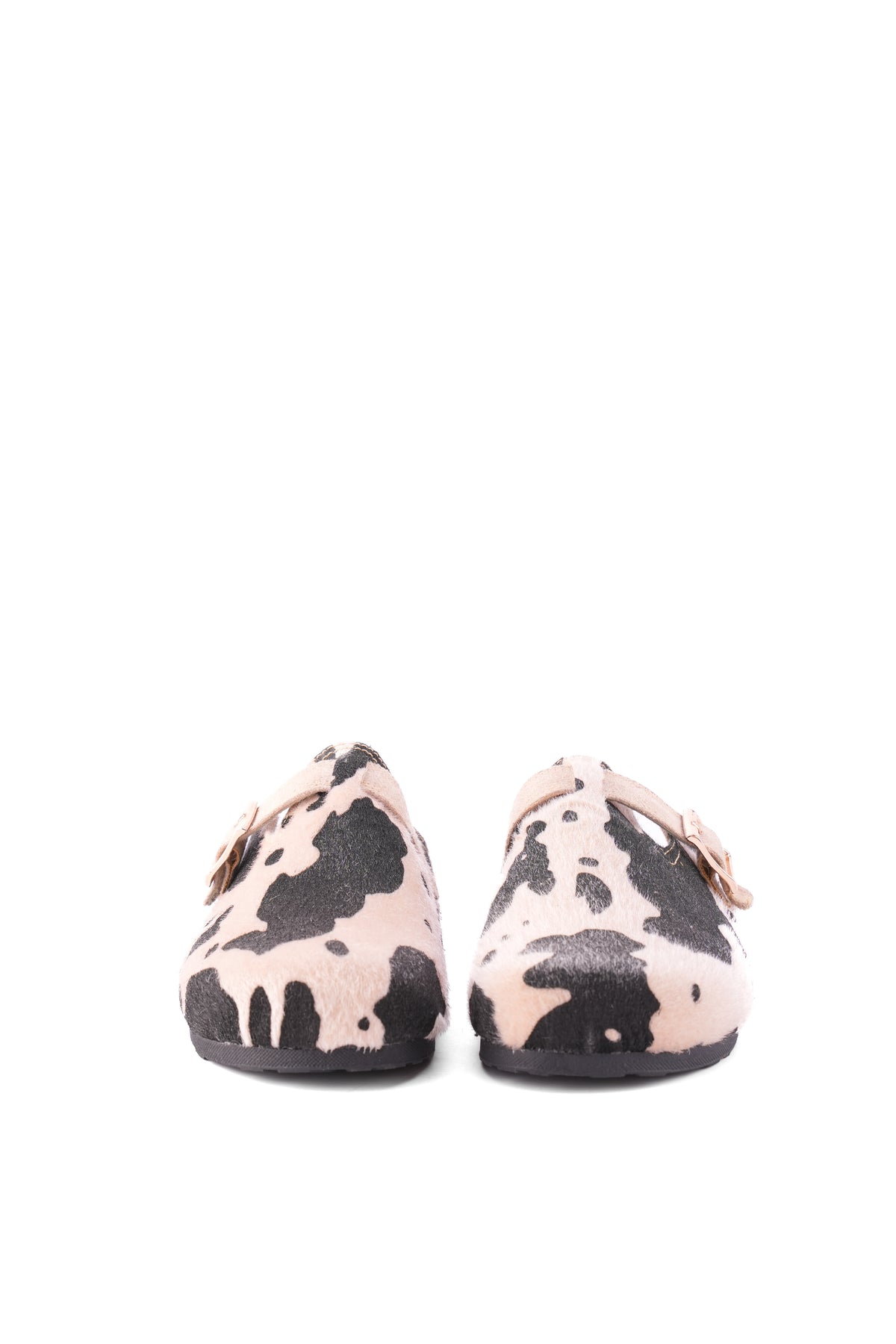 Fresh Cow Print: The closed-toe upper features a striking light beige and black cow print over a soft, textured material (like faux fur or textile), giving a chic, bright nod to the cow print footwear aesthetic.