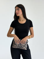 Fierce meets glamorous in this brown leopard print envelope clutch, embellished with subtle sequins for a touch of sparkle. The striking animal print design is elevated with a sleek silver-tone bar accent, giving it a modern edge. Perfect for nights out, special occasions, or adding a bold twist to your outfit, this clutch is a must-have statement accessory for the confident trendsetter.