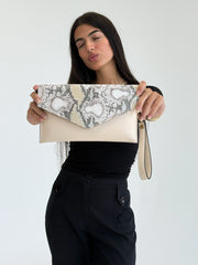 Turn heads with this sophisticated envelope clutch, designed with a striking faux snakeskin flap paired with a sleek black leatherette body. The silver-tone chain strap adds versatility, allowing you to carry it as a shoulder bag or a handheld clutch. Perfect for evenings out, parties, or elevating any chic look, this bag combines modern elegance with a bold statement finish.