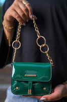 Make a bold statement with the Emerald Luxe Mini Chain Bag, a striking accessory that blends modern chic with timeless glamour. Crafted from glossy patent faux leather in a vibrant emerald green shade, this compact bag features a sleek structured silhouette and gold-tone hardware for a luxurious finish.
