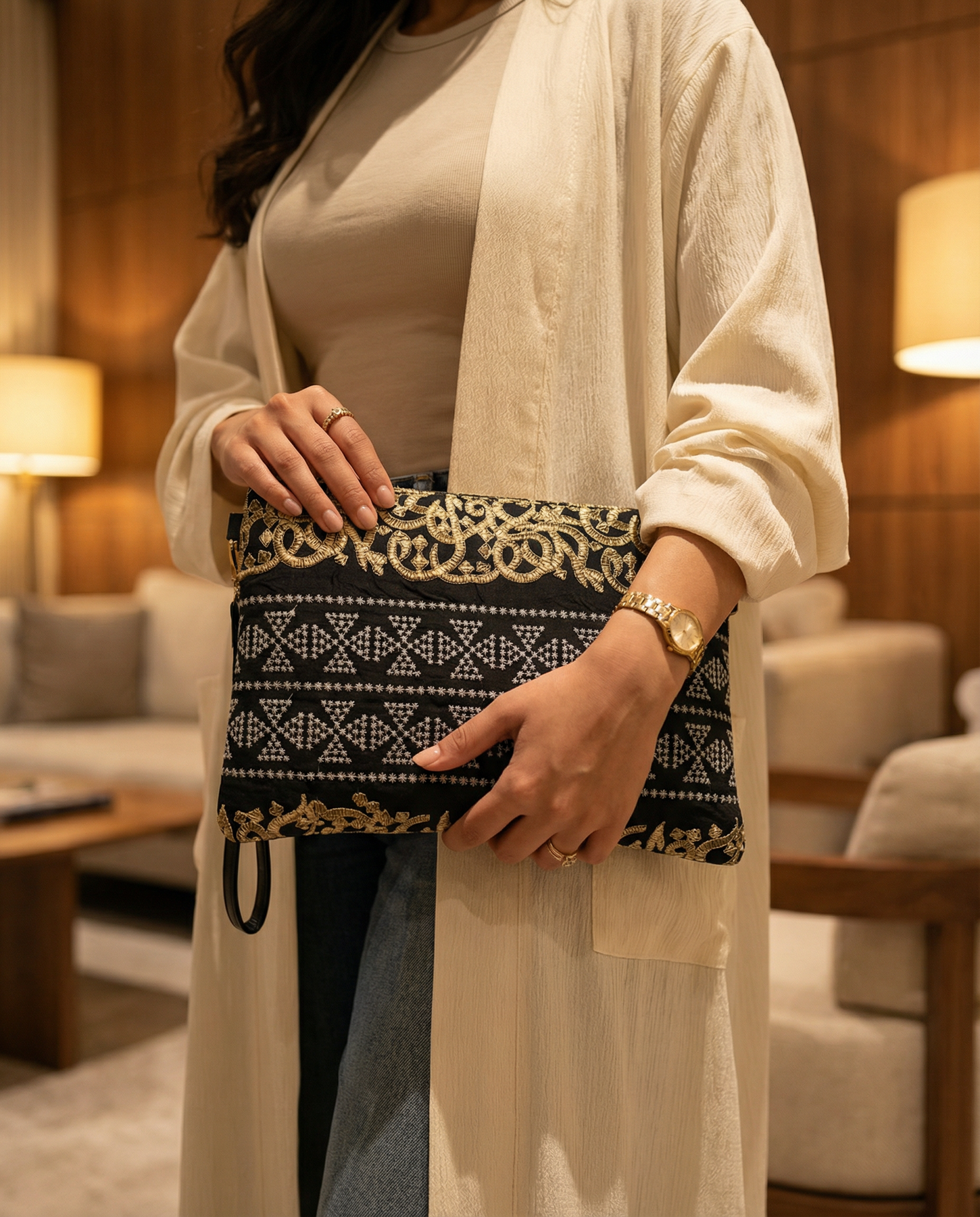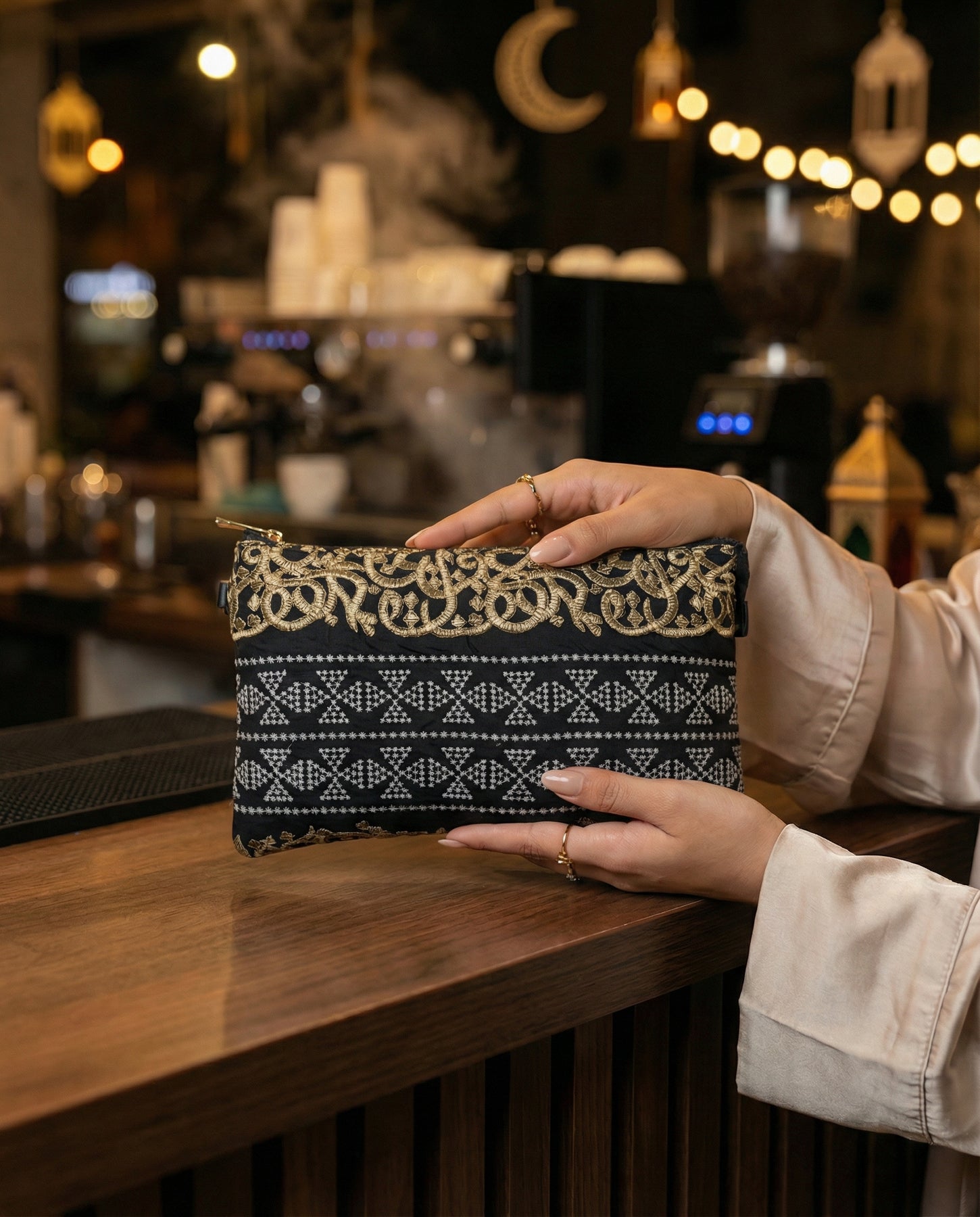 Meet the Asala Clutch—the ultimate finishing touch for your Ramadan wardrobe. Featuring a striking geometric bronze pattern on a luxe velvet-feel base, this piece catches the light perfectly during evening gatherings.